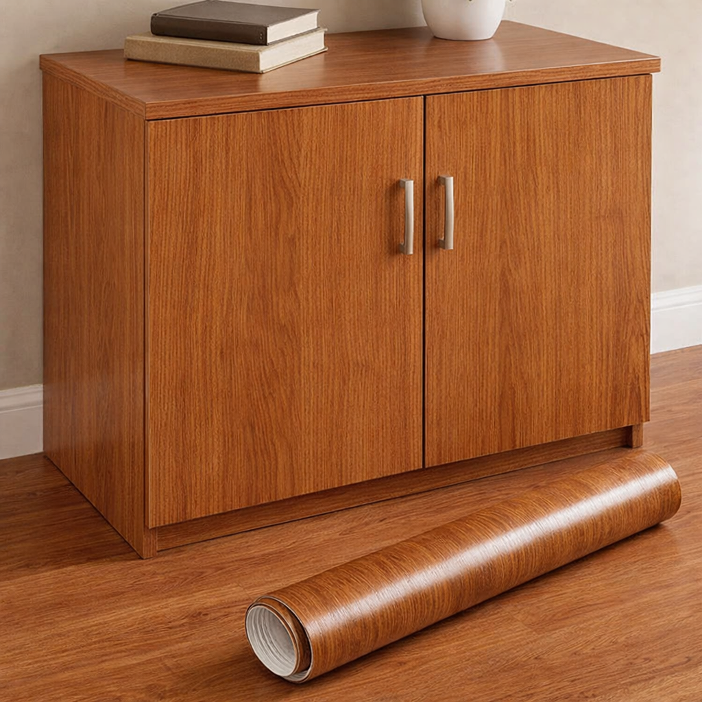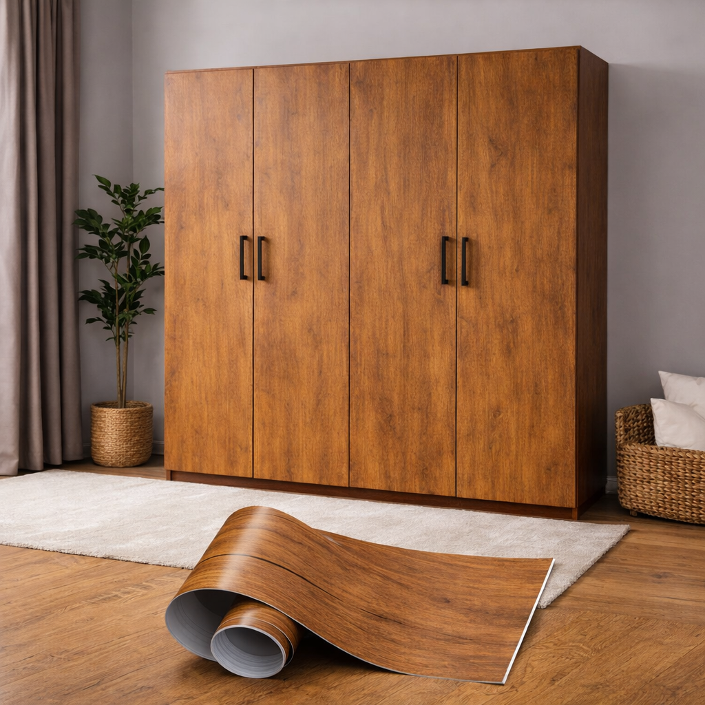 Convierte muebles viejos, paredes dañadas y superficies desgastadas en espacios modernos con Vinilo Adhesivo Café Madera Premium.